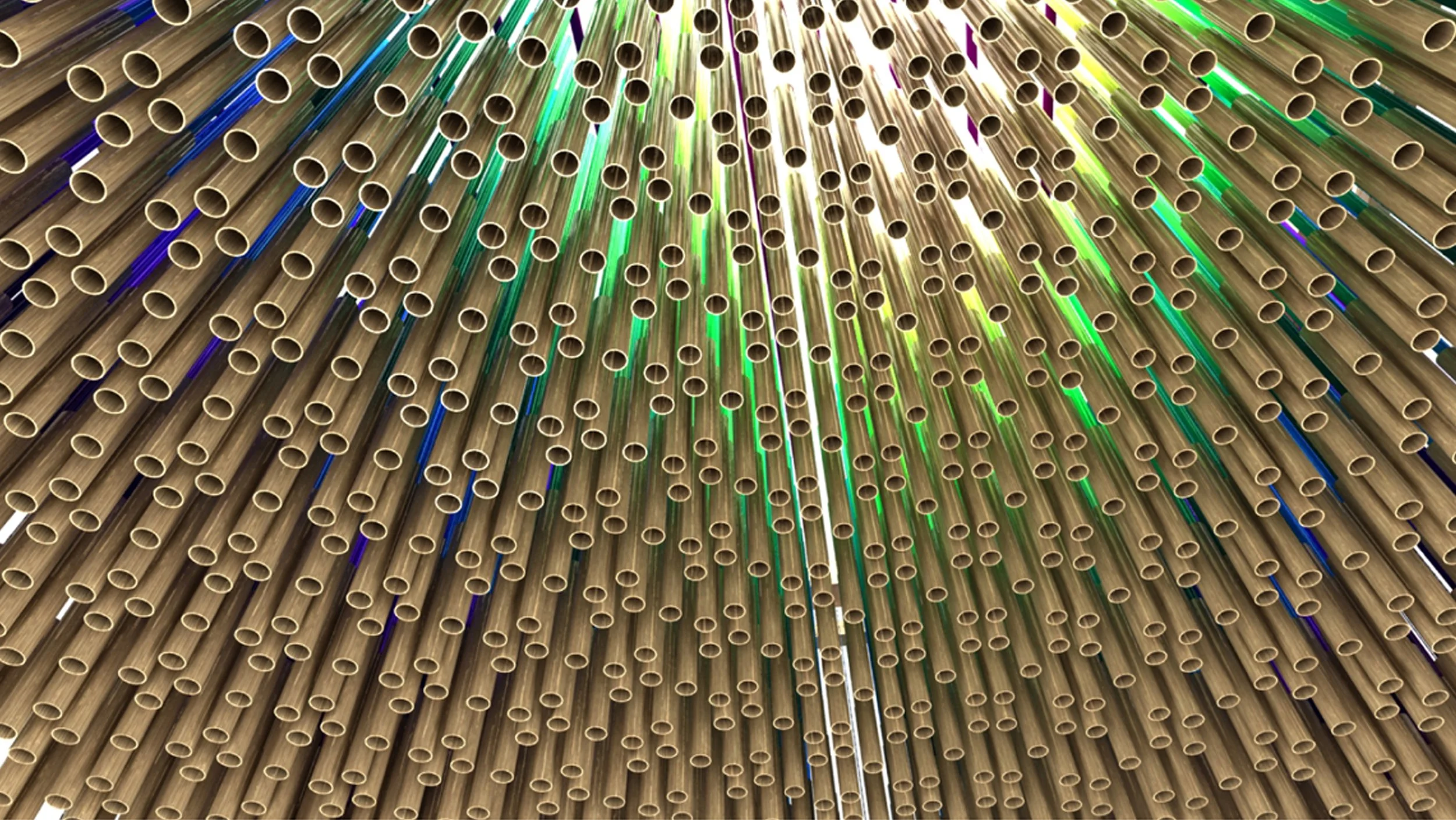 The proposed sukkah structure consists of 960 bamboo tubes hung on the colored strings and suspended within a rigid frame. The hung tubes form the topography of Mount Sinai. Different altitudes in typography are represented by different colors. The complexity of the color pattern is derived from a script that automatically assigns an RGB value to different height intervals.